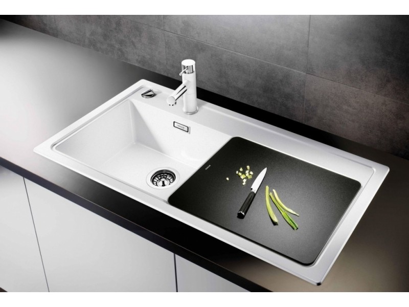 - Разделочная доска из закалённого стекла имеет возможность передвигаться вдоль мойки, за счет постановки смесителя на отдельной площадке.