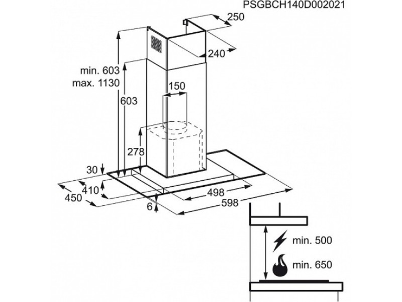 конструкция Т-образная, монтаж настенный, управление кнопочное, производительность вытяжки 603 м³/ч, ширина 59.8 см