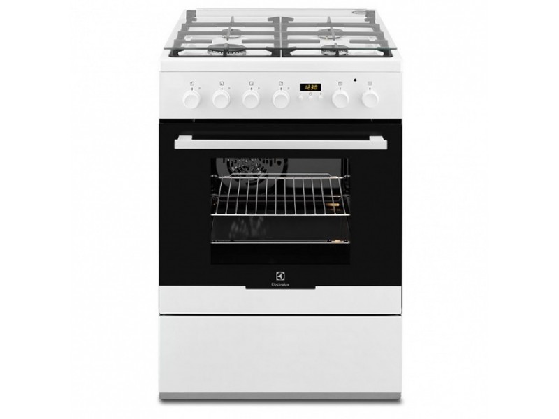 Комбинированная плита с газовой варочной поверхностью, электрической духовкой и электрическим грилем, 60см шириной, белого цвета, мультифункциональная электрическая духовка, электронное управление с отключением духовки и программированием отложенного старта, чугунные держатели для посуды, газконтроль варочной поверхности, интегрированный автоподжиг варочной поверхности, решётчатые направляющие, эмаль лёгкой очистки, термостат, освещение духовки, ящик для хранения противней,