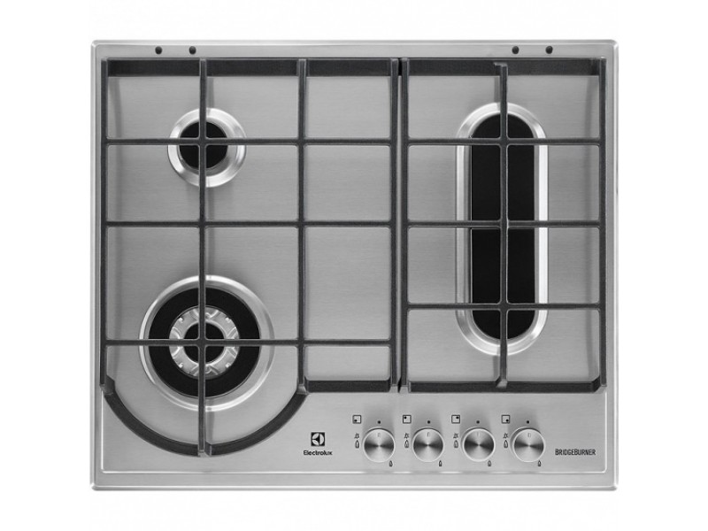 Газовая варочная поверхность, 2 чугунных держателя, газконтроль варочной поверхности, интегрированный автоподжиг варочной поверхности, конфорки: газовая, стандартной мощности, конфорка Bridge, средней мощности, газовая, с тройным рядом пламени, конфорка Bridge, средней мощности,