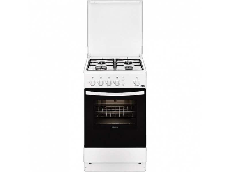 Газовая плита с газовой духовкой, 50см шириной, белого цвета, газовая духовка, эмаль, автоподжиг варочной поверхности, штампованные направляющие, эмаль лёгкой очистки, освещение духовки, автоподжиг духовки, газконтроль духовки, отсек для хранения противней с металлической крышкой,