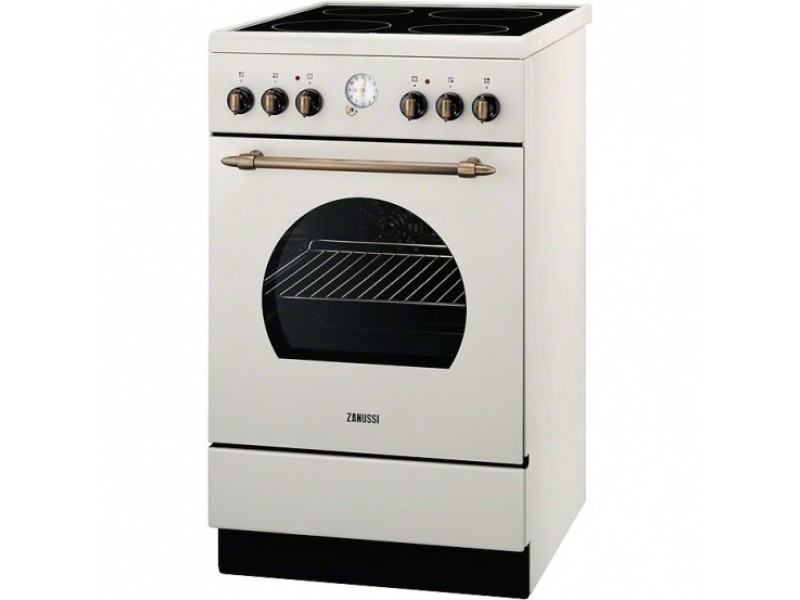Электрическая плита со стеклокерамикой, 50см шириной, цвет - белый Антик, мультифункциональная электрическая духовка, механический таймер с отключением духовки и программированием отложенного старта, штампованные направляющие, термостат, освещение духовки, легкосъёмное внутреннее стекло, ящик для хранения противней,
