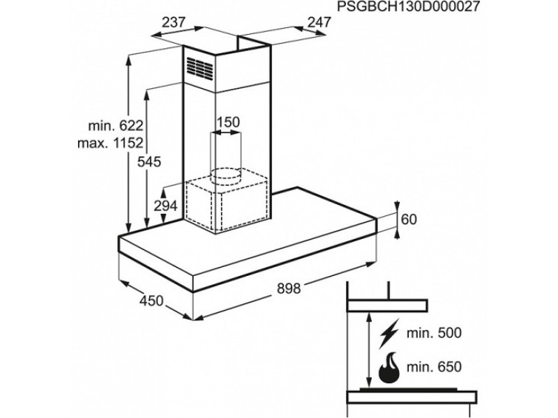 конструкция Т-образная, монтаж настенный, управление электронное/кнопочное, производительность вытяжки 603 м³/ч, ширина 89.8 см